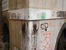 | Si dice che chi pesta la pietra rossa vada male all'esame di scuola (è nella strada che va al Sarpi) o che porti sfiga. Una volta si diceva che lì si fermò la peste...lasciamo perdere. Sta di fatto che a un mio amico quando gli si ricordò che pestare la pietra rossa porta jella la schivò e si prese il capitello della Madonna che sporge dal sottoportico in viso. |